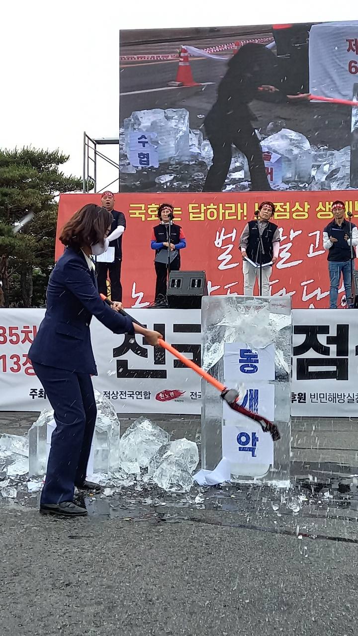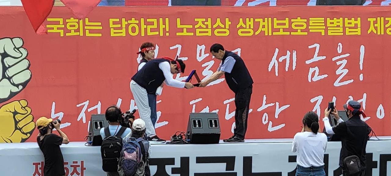 동지들! 우리는 비상한 각오로 세상에 외치자 ‘벌금 말고 세금을! 노점상도 당당한 직업이다!’ 그리고 우리의 단결된 투쟁으로 노점상 생계보호특별법을 제정하자!