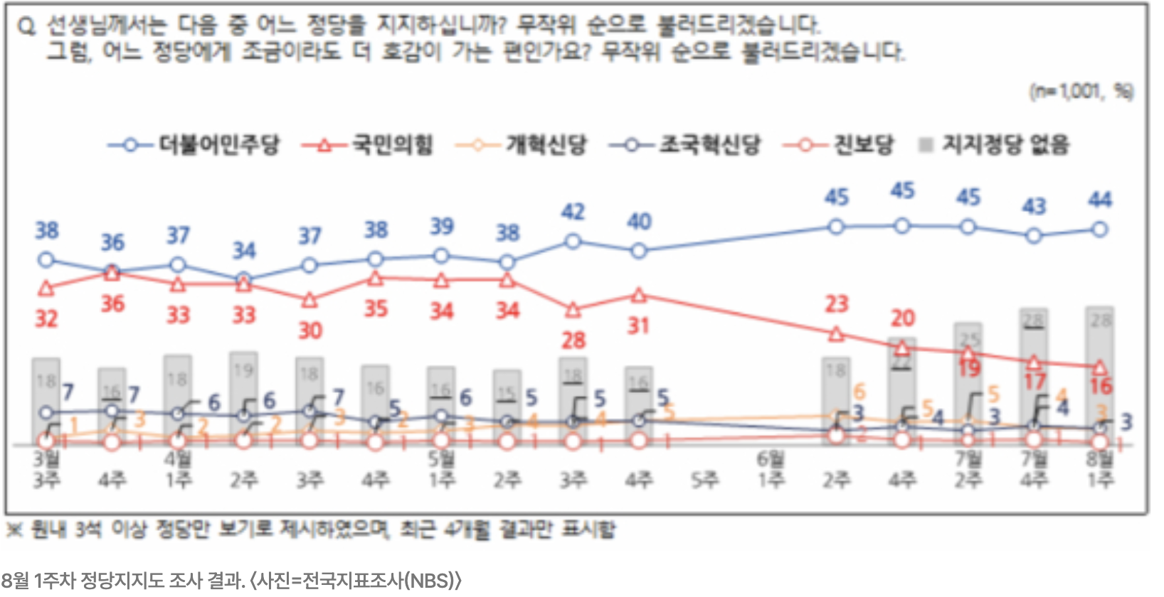 - 엠브레인퍼블릭·케이스탯리서치·코리아리서치·한국리서치가 지난 4일부터 6일까지 실시한 NBS 조사 결과, 국민의힘의 지지는 **2주 전보다 1%p 하락한 16%**였음