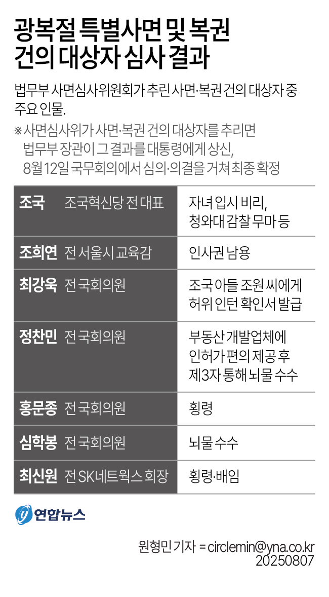 .※ 사면심사위가 사면·복권 건의 대상자를 추리면 법무부 장관이 그 결과를 대통령에게 상신, 8월 12일 국무회의에서 심의·의결을 거쳐 최종 확정.